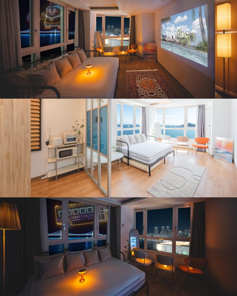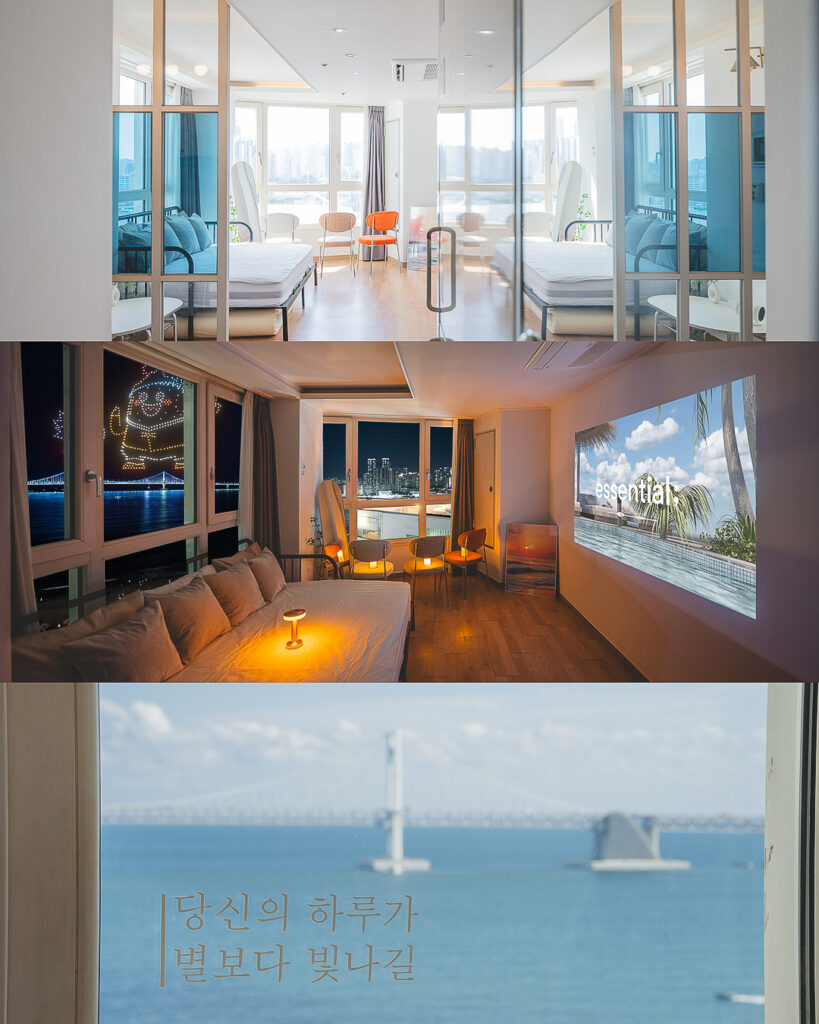 저는 광안리 드론쇼 팀의 공식 포토그래퍼로 햇수로 3년 이상 활동하면서 수많은 공연 장면을 촬영해 왔습니다. 그 경험을 살려 이번 촬영에서도 드론쇼와 숙소 내부를 동시에 담아내는 작업을 진행했습니다. 창가 너머 펼쳐지는 화려한 빛과 따뜻한 조명이 켜진 객실이 조화를 이루는 장면은, 다른 지역의 숙소에서는 결코 얻을 수 없는 광안리만의 장점입니다. 사진을 보는 순간 ‘여기서 이 장면을 직접 보고 싶다’는 욕구를 불러일으키는 것이죠.