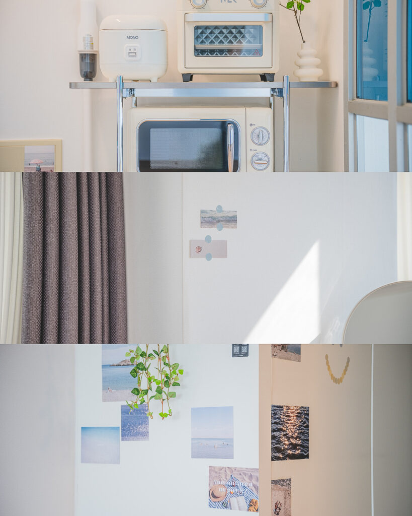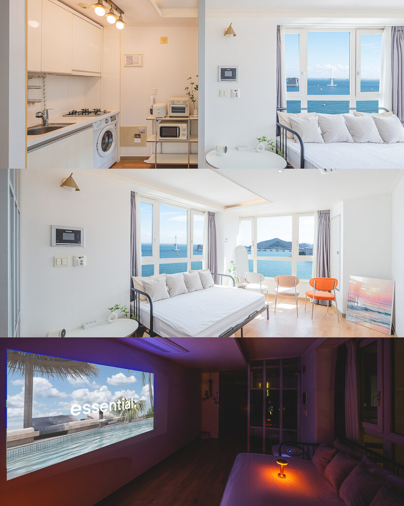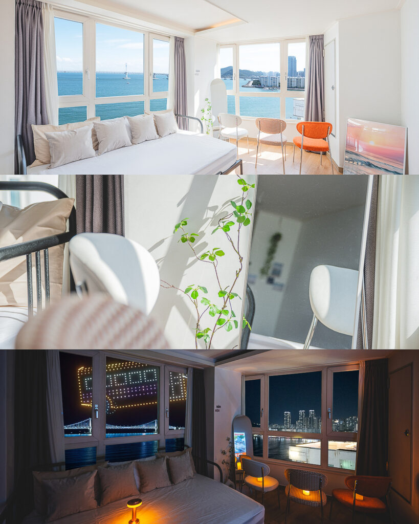공간 자체의 인테리어는 심플하면서도 뷰를 방해하지 않는 구성이었습니다. 화이트 톤 벽과 최소한의 가구 배치는 사진에서 오션뷰를 더 돋보이게 해주었습니다. 낮에는 창문을 통해 들어오는 자연광 덕분에 깨끗하고 시원한 이미지를 보여줄 수 있었고, 밤에는 은은한 오렌지 톤 조명을 활용해 아늑한 무드를 살렸습니다. 이처럼 같은 공간이 시간대에 따라 전혀 다른 인상을 줄 수 있다는 점을 사진으로 풀어내는 것이 숙소 촬영의 묘미이자, 숙소 홍보의 핵심입니다.