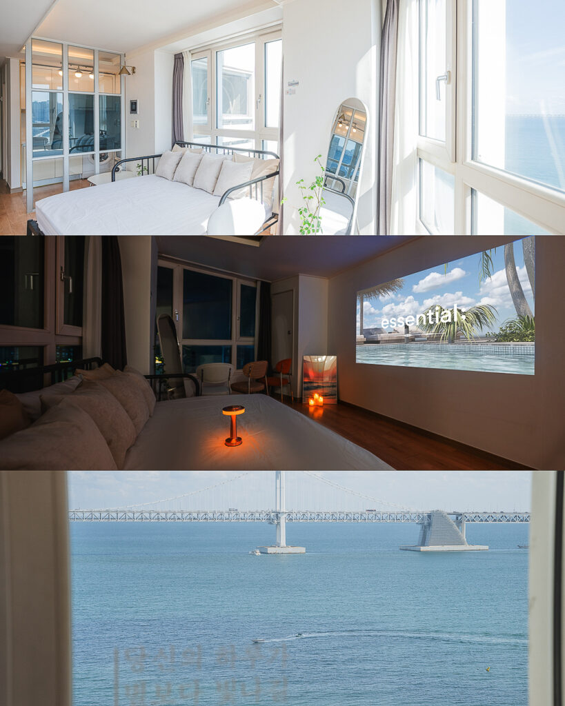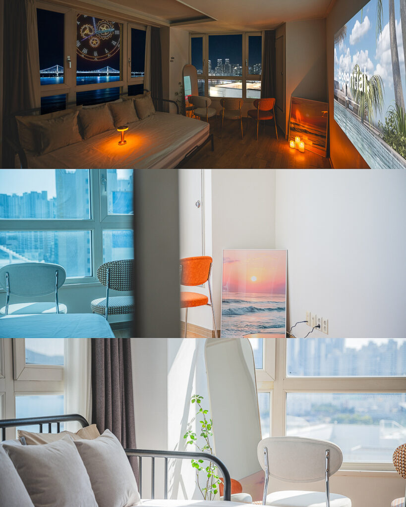 낮 시간대에는 광안리 바다가 가진 청량함을 살려내는 것이 중요합니다. 창문을 크게 열고 들어오는 햇빛과 푸른 하늘, 바다를 동시에 담으면 공간이 훨씬 탁 트여 보입니다. 광안리 에어비앤비 손님들이 낮에 숙소를 예약할 때 가장 눈여겨보는 것이 바로 이런 시원한 뷰입니다. 그래서 촬영 구도를 짤 때도 바다와 하늘이 자연스럽게 들어오면서, 객실의 깔끔한 인테리어가 방해받지 않도록 세심하게 조율합니다. 작은 소품 하나, 가구 배치 하나도 뷰와의 조화를 깨뜨리지 않도록 신경 씁니다.
